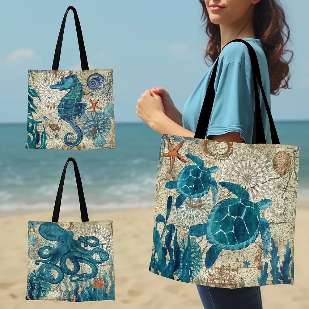 1 pc turtle octopus seahorse whale pattern map vintage, shoulder bag, lightweight full storage bag, multifunctional shopping