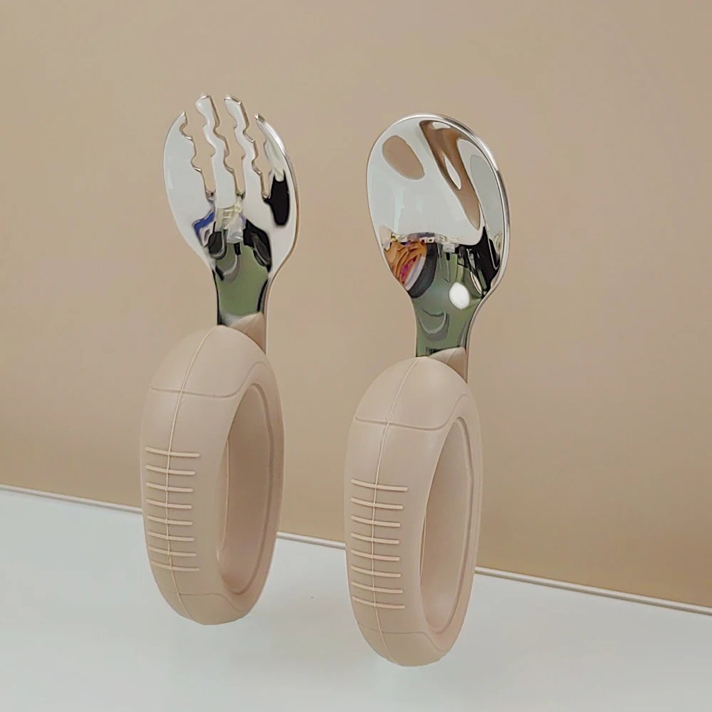 New training easy to grip fork spoon short handle learn molar artifact silicone Baby stainless steel fork spoons