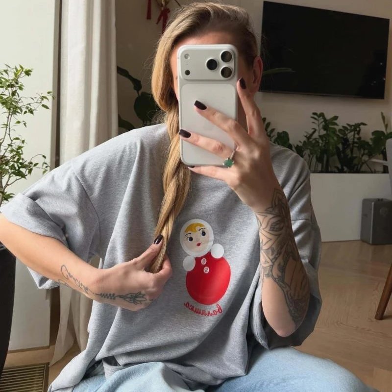 Pure Cotton Gray Oversized Chic T-shirts Cute Cartoon Russian Nesting Doll Printed Sweet Women Girls Large Size Summer Tee Tops