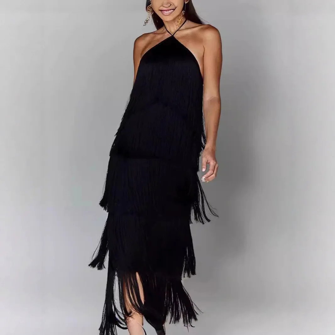Women's Halter Neck Fringe Backless Slit Dress Birthday Dress Evening Party Date Night Elegant Sexy Long Dress Evening Gown